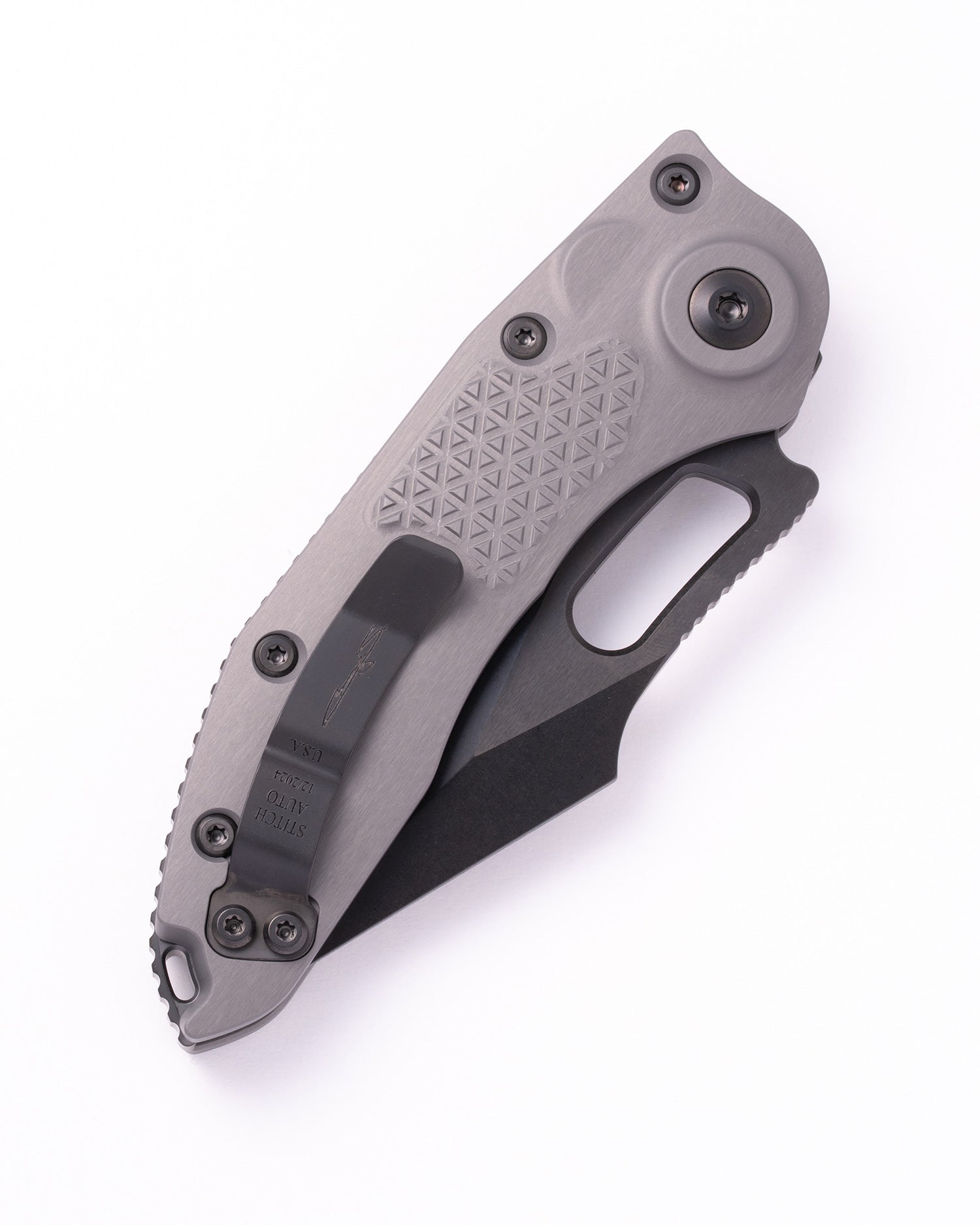 The Microtech Stitch® is a production version of the custom knife collaboration between Marfione Custom Knives® and Borka Blades. This model features a substantial choil and thumb ramp, spear point style blade and a knurled alloy handle with a black finish. Most of our Stitch® Auto knives come fitted with bead blasted hardware (unless DLC or Tactical) and a secure right hand, tip-up carry pocket clip.